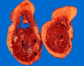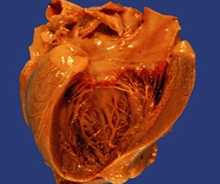 En la imagen se observa un corazón cortado transversalmente, en el cual se pueden diferenciar perfectamente el ventrículo izquierdo (en la zona inferior de la imagen) y el ventrículo derecho (en la zona superior de la pantalla). La superfície de las paredes de los ventrículos se observan de color rojo pardo y de superficie lisa y brillante, pero podemos observar una pequeña lesión, en la pared del ventrículo izquierdo, de color blanco-grisácea. Esta lesión se conoce como absceso producido por la infección por Aspergillus.