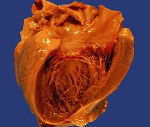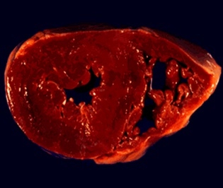 En la imagen se observa un corazón cortado transversalmente, en el cual se pueden diferenciar perfectamente el ventriculo izquierdo (a la izquierda de la imagen) y el derecho ( a la derecha de la imagen). No se observa ninguna anomalia en particular ya que la la superfície se observa de color rojo pardo y lisa, sin irregularidades. Hay que destacar que las paredes del ventrículo izquierdo han aumentado de tamaño al doble del tamaño normal. Esto se conoce como hipertrofia del ventrículo izquierdo.